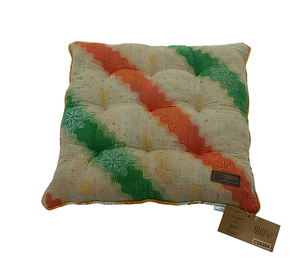 The Quote Copenhagen vintage sari sitting cushions are hand -embroidered with small white Kantha stitches and is filled with natural fiber. They measure 40x40 and are perfect as a seat cushions, but are also an obvious choice for both benches and garden furniture. The cushions are randomly composed in colors and patterns and therefore have a natural and unique expression. Lapped holes, smaller stains and wear can occur, but testify to a past life, in a charming and unique way. Our vintage seat cushions are perfect for you who would like more colors and a more consistent look in your decor. You have the opportunity to create the perfect lounge by combining the sitting cushions with eg. ours Unique Sari pillows. You can also create extra coziness in the garden or on the couch with our Vintage Sari Plaid, For the cool summer evenings.